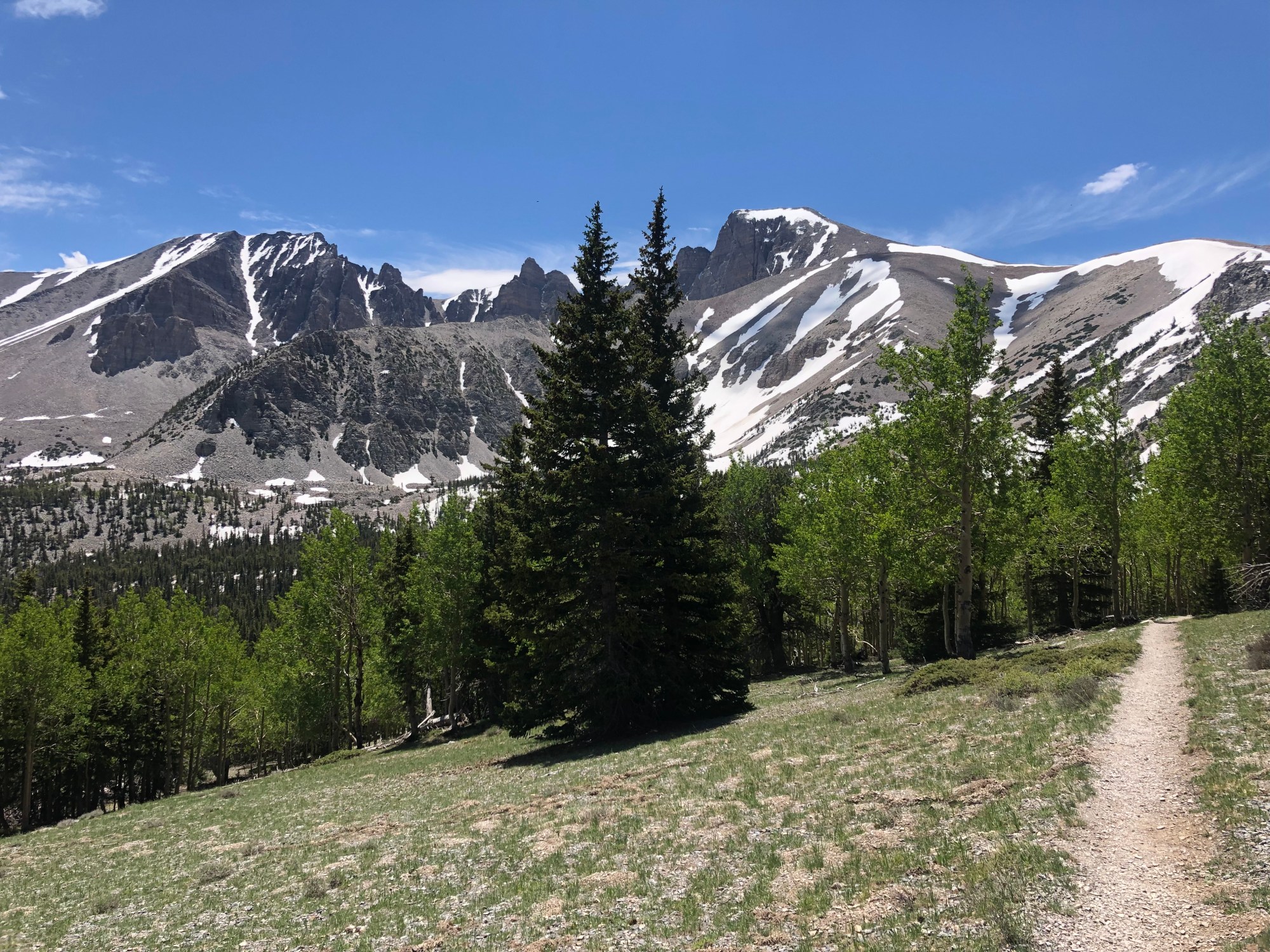 Wow. Wheeler exceeded all expectations. I felt like I was hiking in the Sierra. I left the car around 6:30 and was hiking on a gently graded trail through aspens. A mile or so later the trail branched off to Stella lake and the Bristlecone pine trail. I wanted to see the Bristlecone pines but the trail is still under snow with some steep traverses and I’m just not into that. So I kept on up to Wheeler. Once I got up on the shoulders the wind really picked up and my blue wind shirt was no longer effective. Which is something that has never happened before. The blue wind shirt is usually always effective when I wear it. I was glad I had thought to toss my rain jacket into my day pack and I put it on and presto: no more wind chilling me. I carried on and by 9:30 I made it to the summit. There were a couple of other hikers there, and I chatted with an older couple from Menlo Park about hiking in the West. They seemed so familiar I’m sure I have seen them somewhere on some lonely peak.